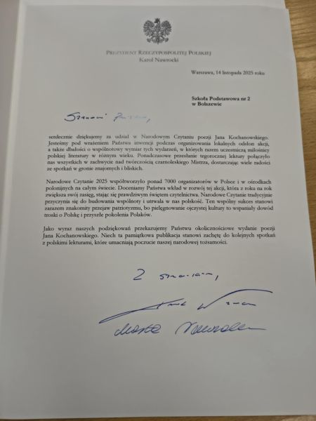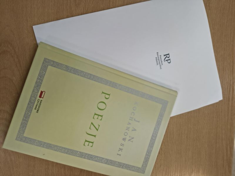 Do biblioteki szkolnej dotarła specjalna przesyłka z Kancelarii Prezydenta Rzeczpospolitej Polskiej. Bardzo dziękujemy za wydanie specjalne dzieł Jana Kochanowskiego, które dostaliśmy za udział w akcji organizowanej właśnie przez Prezydenta RP : Narodowe Czytanie.