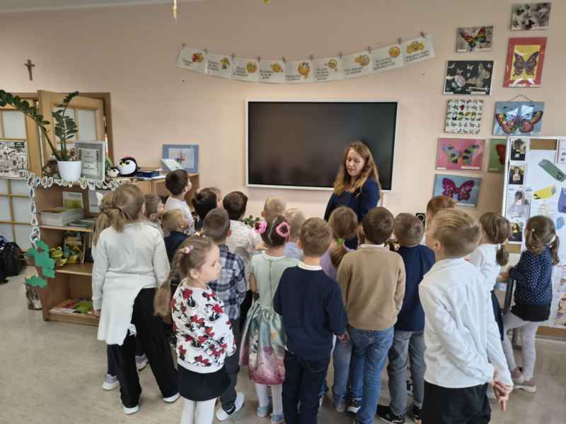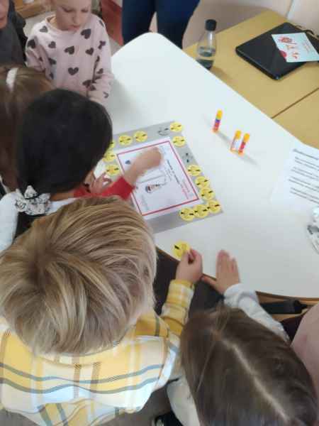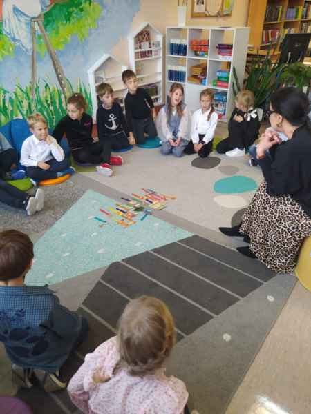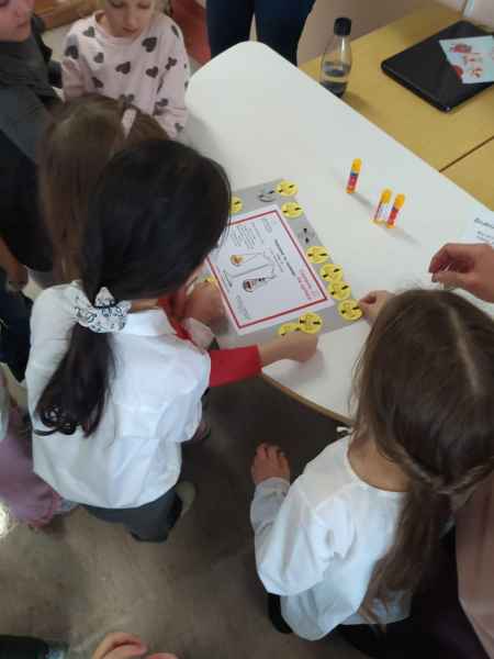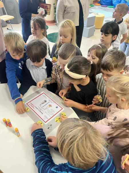 Następnie każda klasa otrzymała dyplom pasowania, do którego uczestnicy przykleili złotówki ze swoim imieniem, na znak akceptacji regulaminu biblioteki i bycia jej czytelnikiem.