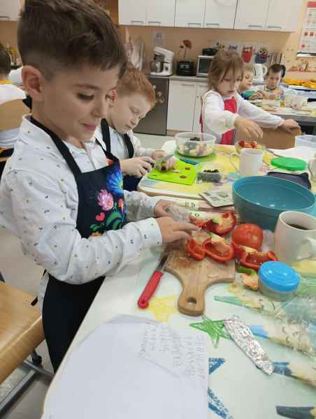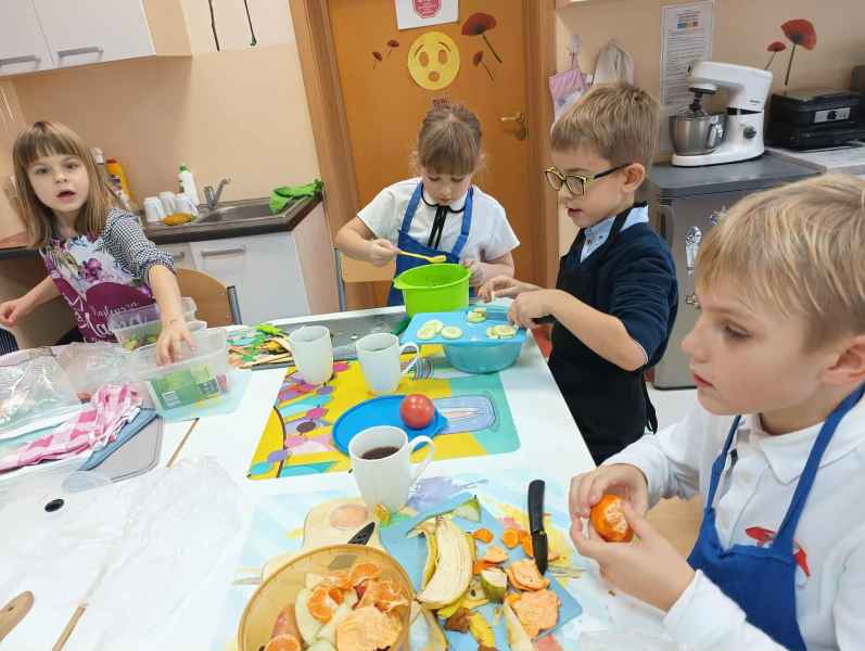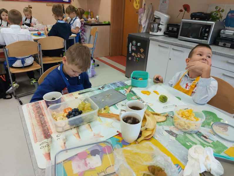 Wspólne krojenie, mieszanie i smakowanie było prawdziwą przygodą pełną zdrowych kolorów i zapachów. Na zakończenie wszyscy rozkoszowali się aromatyczną herbatką i z radością kosztowali swoich kulinarnych dzieł. To były zajęcia, które pokazały, że zdrowe jedzenie może być nie tylko wartościowe, ale też smaczne i pełne zabawy!