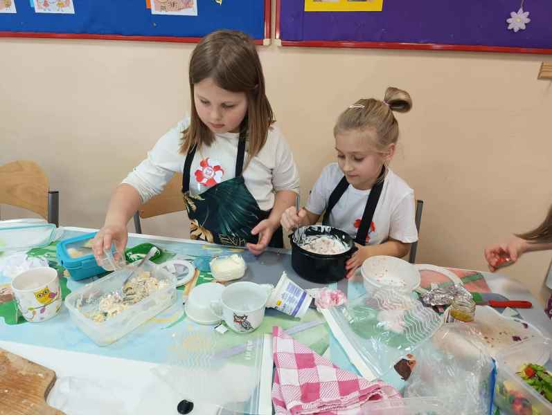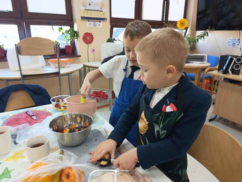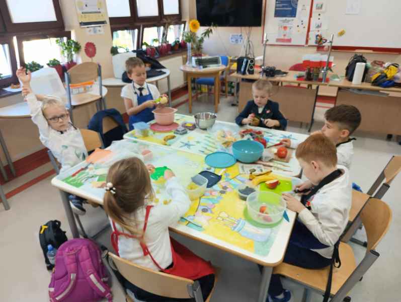 W ramach realizacji projektu edukacyjnego „Planeta Zdrowia” uczniowie klasy 1a uczestniczyli w wyjątkowych zajęciach kulinarnych. Dzięki zaangażowaniu i ogromnej pomocy naszych mam, pani Anny oraz pani Marty, dzieci samodzielnie przygotowały w szkolnym Laboratorium Przyszłości pyszne sałatki owocowe i warzywne.