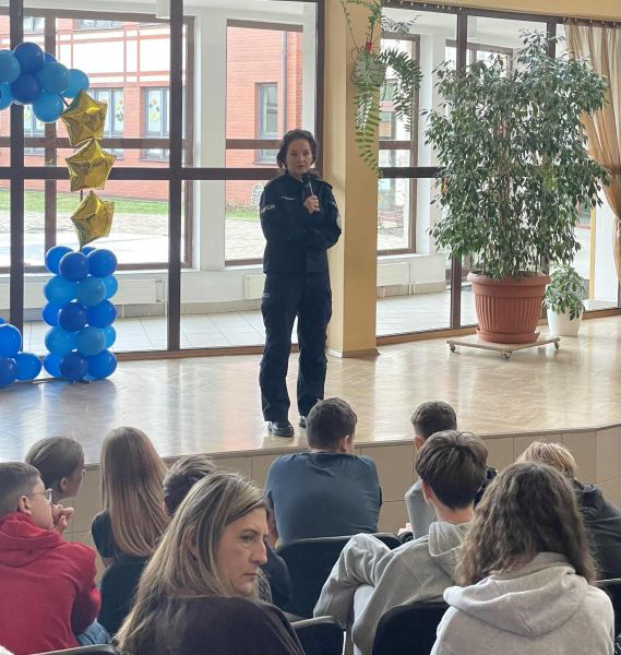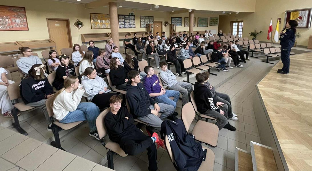 Podczas prelekcji poruszono tematy związane m.in. z: odpowiedzialnością nieletnich za czyny karalne oraz demoralizację, konsekwencjami prawnymi stosowania przemocy, posiadania substancji zakazanych i niszczenia mienia, zasadami bezpiecznego korzystania z Internetu i mediów społecznościowych, reagowaniem na sytuacje zagrożenia oraz możliwościami uzyskania pomocy, kształtowaniem postaw odpowiedzialności, szacunku i troski o bezpieczeństwo własne i innych. Uczniowie aktywnie uczestniczyli w spotkaniu, zadając pytania i dzieląc się własnymi doświadczeniami. Prelekcja została przyjęta z dużym zainteresowaniem, a treści przekazane przez funkcjonariusza znacząco wpłynęły na poszerzenie wiedzy młodzieży dotyczącej konsekwencji podejmowanych działań. Tego typu inicjatywy wspierają proces wychowawczy i pomagają młodym ludziom w podejmowaniu świadomych, bezpiecznych i odpowiedzialnych decyzji.