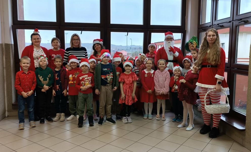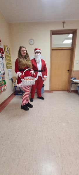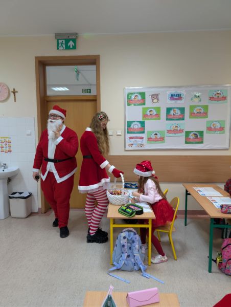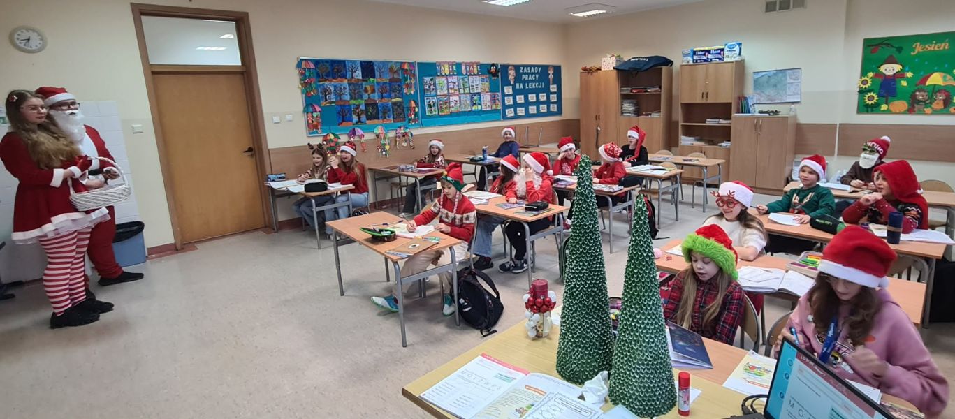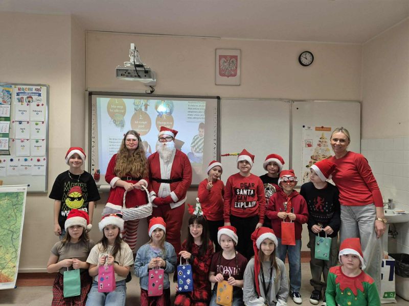 Dzisiejszy dzień w naszej szkole był wyjątkowy! Już od rana na korytarzach królował kolor czerwony, a radosna atmosfera sprawiła, że wszyscy poczuliśmy, że święta są tuż-tuż. Każdą klasę odwiedził Mikołaj wraz z Panią Mikołajową, którzy obdarowali każdego grzecznego ucznia słodkim cukierkiem. Było wiele uśmiechów, radości i ekscytacji na widok wyjątkowych gości. Nie zabrakło też wspólnego kolędowania, które wprowadziło nas w prawdziwie świąteczny nastrój.