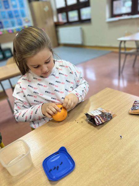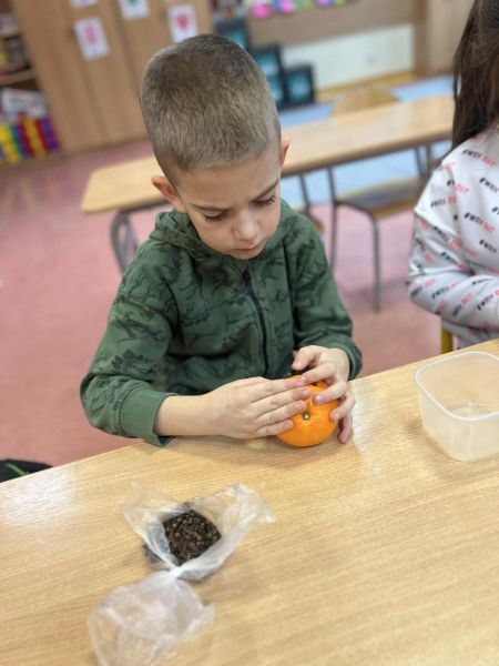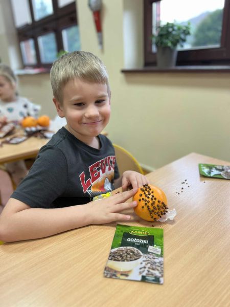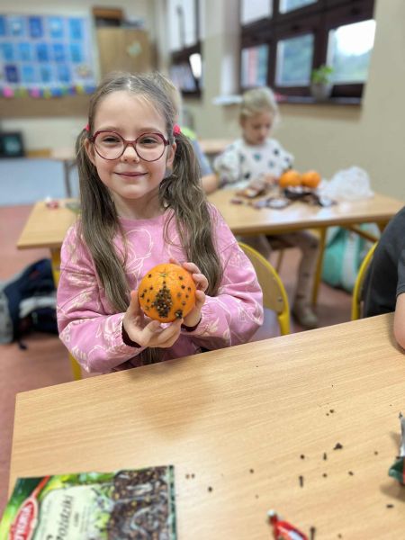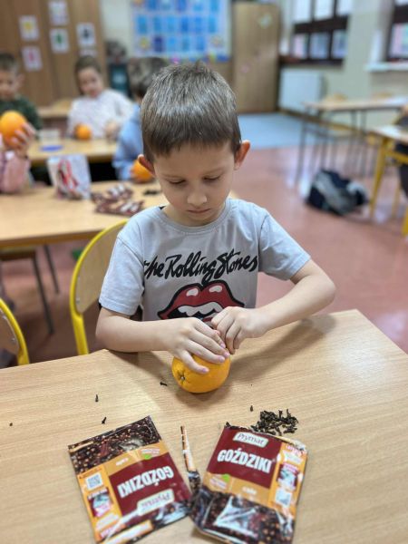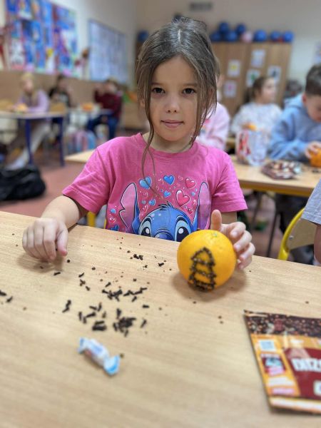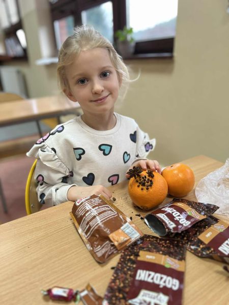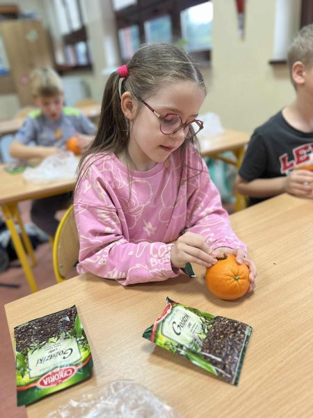 Uczniowie klasy 1d wzięli udział w wyjątkowych, pachnących zajęciach . Dzieci tworzyły własne, naturalne ozdoby, wbijając goździki w świeże pomarańcze. Podczas zajęć ćwiczyły motorykę małą, rozwijały kreatywność oraz poznawały tradycje związane z przygotowaniami do świąt.