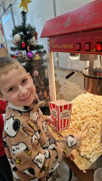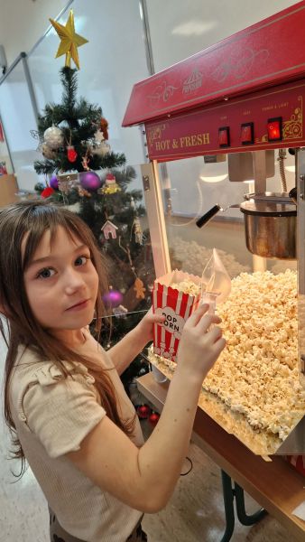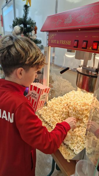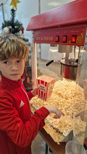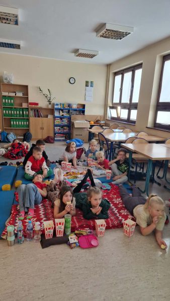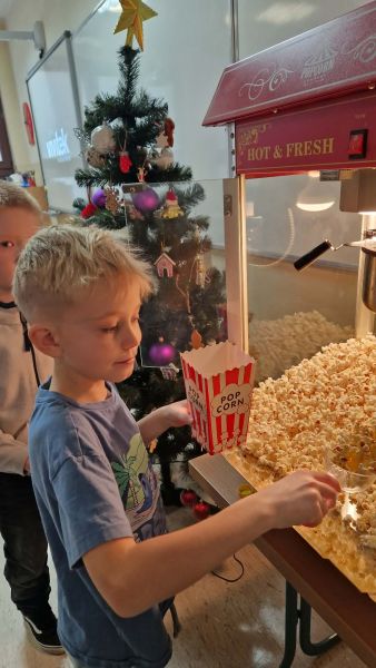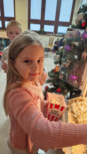 17 grudnia w klasie 2b odbyło się wspólne oglądanie filmu o tematyce świątecznej. Seans filmowy zorganizowany został w nagrodę za sumienne wykonywanie zadań w domu, które wspierają utrwalenie wiadomości poznanych na lekcjach. Dodatkową niespodzianką i ogromną atrakcją był popcorn, który robiliśmy w naszej sali dzięki maszynie do popcornu zakupionej przez Radę Rodziców. Oglądanie filmu przebiegało w miłej świątecznej atmosferze.