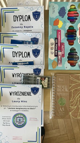 Komiksy: I miejsce – Zuzanna Ropela 5A, II miejsce – Alicja Kwidzińska 4A, III miejsce – Antonina Kaliszuk 5A, wyróżnienia – Liliana Fetta 6B, Laura Hinz 4A.