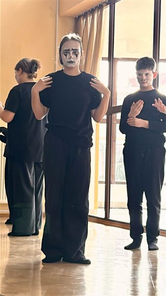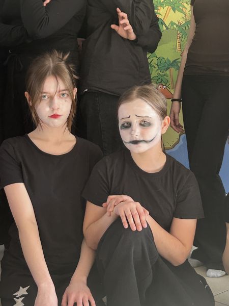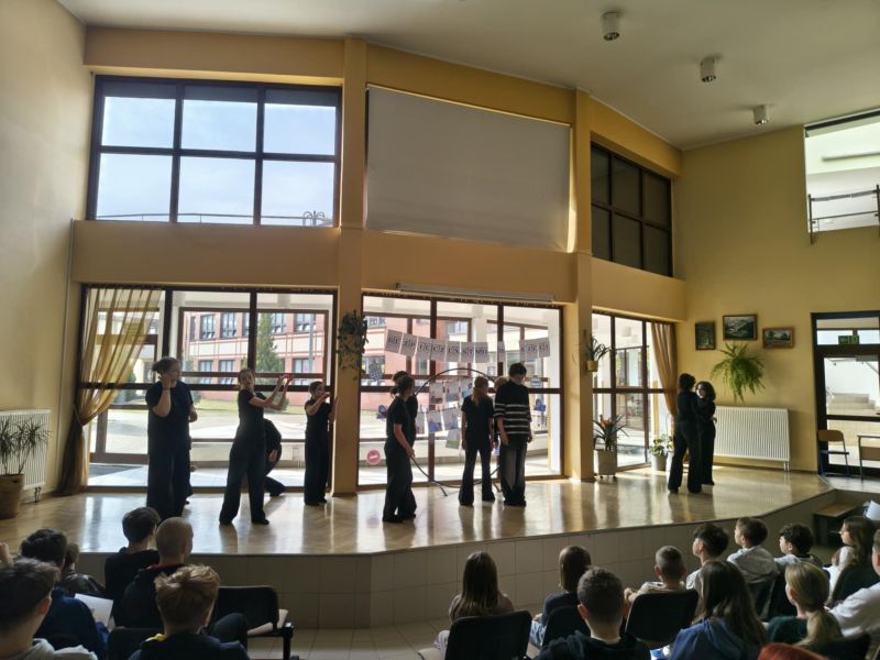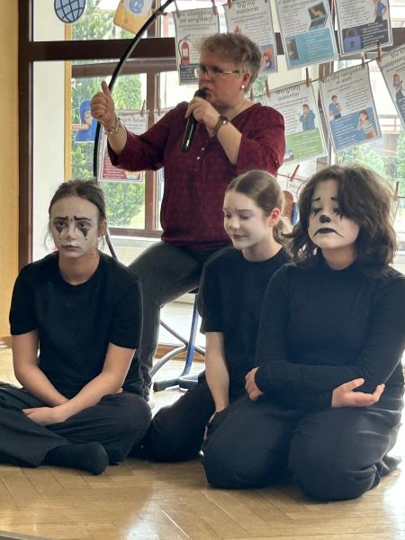 Centralnym punktem wydarzenia było niezwykłe przedstawienie pantomimiczne pt. „Marionetki”, przygotowane przez aktorów Szkolnego Koła Teatralnego „Kwadrat”. Spektakl w sugestywny i symboliczny sposób ukazywał mechanizmy manipulacji, które mogą pojawiać się w świecie online. Aktorzy, operując ruchem i gestem, stworzyli przejmującą opowieść o tym, jak łatwo można zostać „uwikłanym” w sieć zależności, pozorów i fałszywych relacji. Przedstawienie przypomniało widzom, że Internet – choć pełen możliwości – może stać się pułapką, jeśli nie korzystamy z niego świadomie i odpowiedzialnie. Szczególnie wybrzmiała myśl, że nigdy do końca nie wiemy, kto znajduje się po drugiej stronie ekranu i jakie są jego prawdziwe intencje oraz jaki swój cyfrowy ślad pozostawiamy w Internecie.