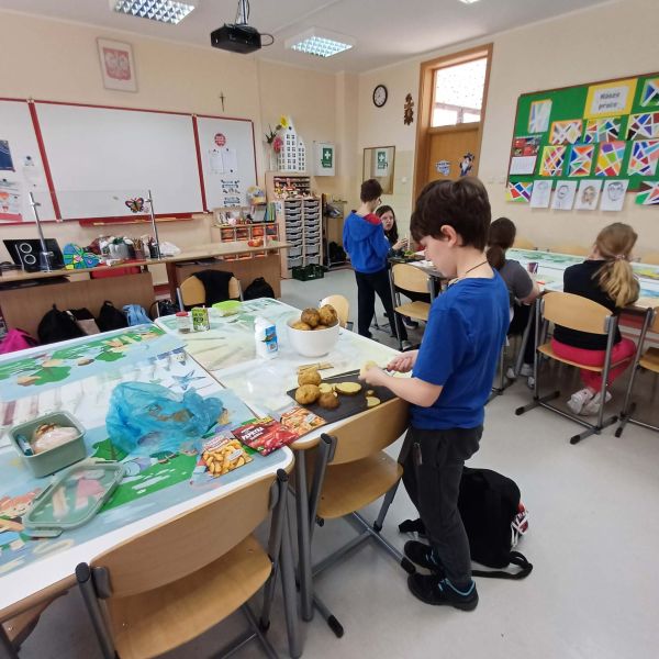 Uczniowie pracowali w grupach, dzieląc się obowiązkami i wspólnie podejmując decyzje dotyczące składników oraz sposobu przygotowania potraw.
