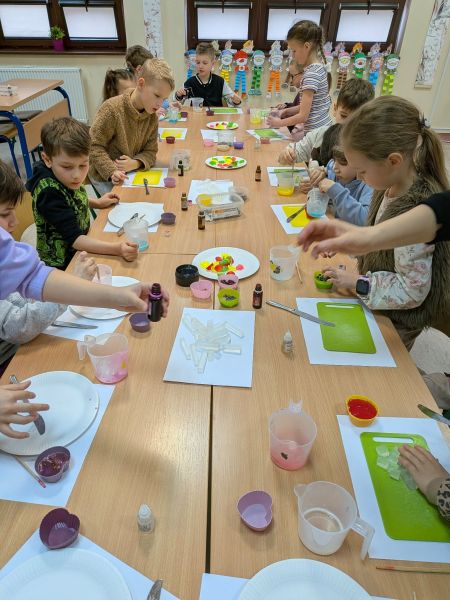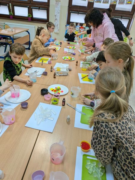 We wtorek, 31 marca, w klasie 1b zapanowała wyjątkowa, kreatywna atmosfera. Pod czujnym okiem pani Aleksandry Hazuki odbyły się świąteczne warsztaty, podczas których uczniowie mieli okazję własnoręcznie wykonać mydełka z gliceryny.