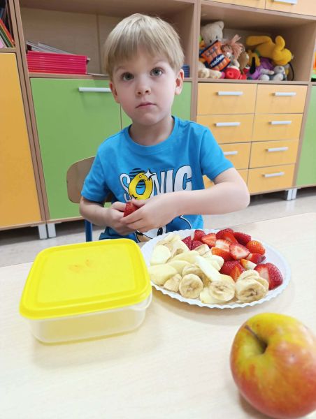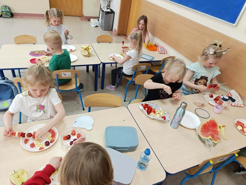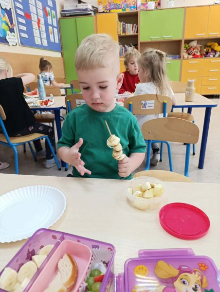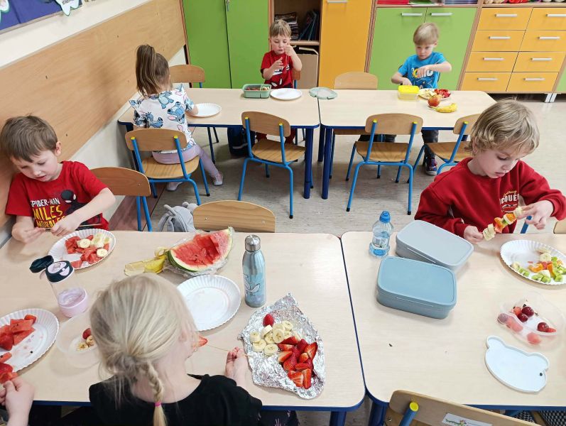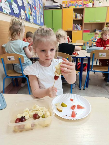 W Oddziale 0d rozmawialiśmy – zarówno o tych dobrze znanych, jak i mniej popularnych. Maluszki chętnie dzieliły się swoją wiedzą i doświadczeniami. W trakcie zajęć wykonaliśmy również pracę plastyczną inspirowaną owocami, a na zakończenie przygotowaliśmy i wspólnie skosztowaliśmy pysznych szaszłyków owocowych.