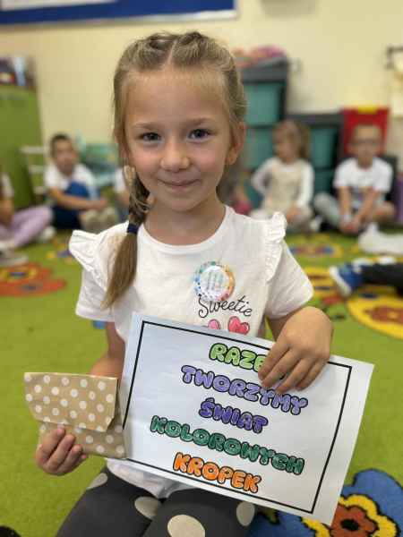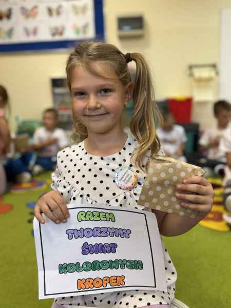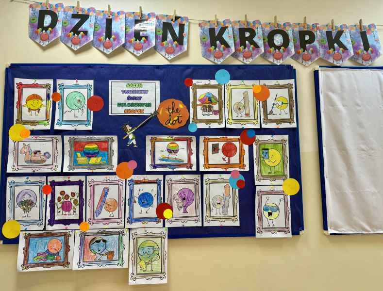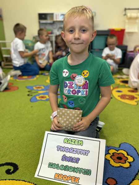 Dzisiaj dzieci z oddziału 0a świętowały Dzień Kropki – wyjątkowe święto kreatywności, odwagi i wiary w siebie. Podczas zajęć: wykonały kolorowe prace plastyczne, obejrzały prezentację i poznały historię Vashti, brały udział w wesołych zabawach ruchowych na sali gimnastycznej, przygotowały własne opaski na rękę, pozowały do zdjęć, a na pamiątkę otrzymały przypinki z okazji Dnia Kropki. To był dzień pełen radości, twórczej zabawy i odkrywania swoich talentów!