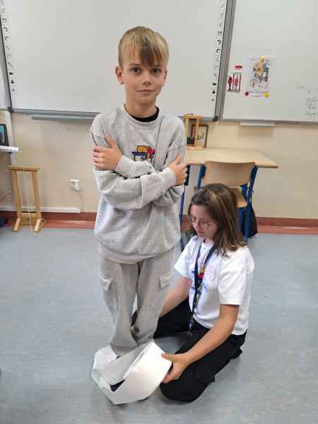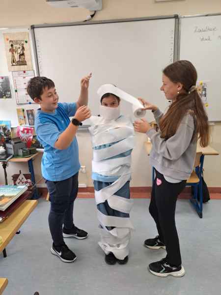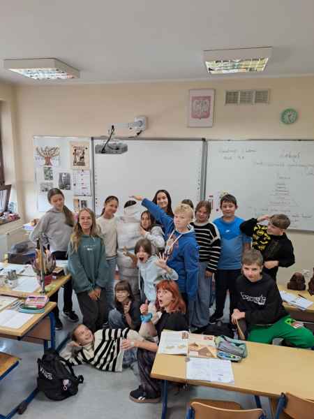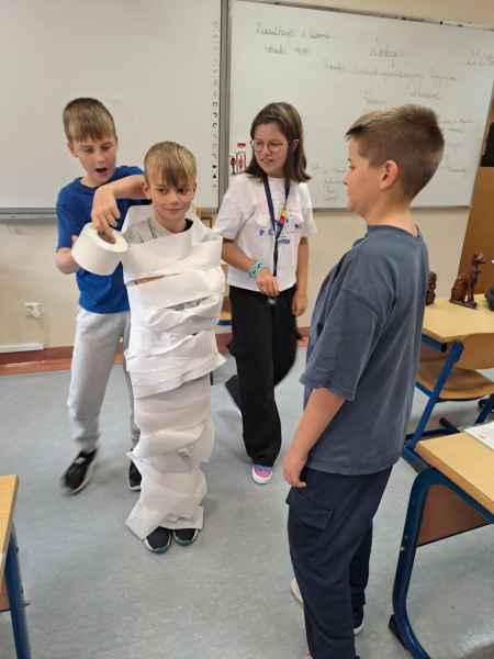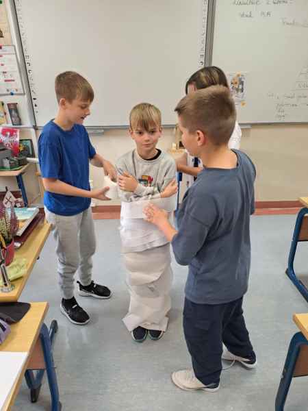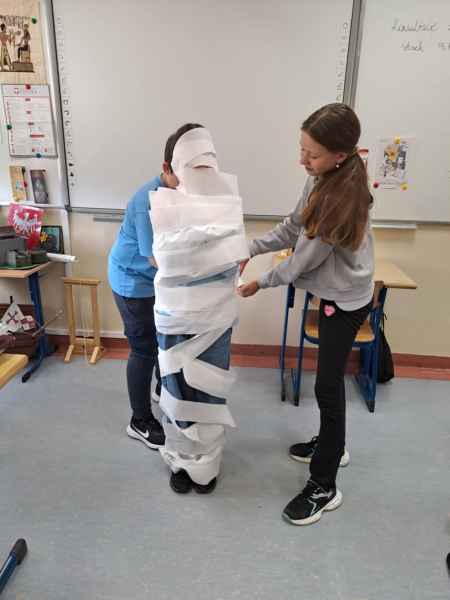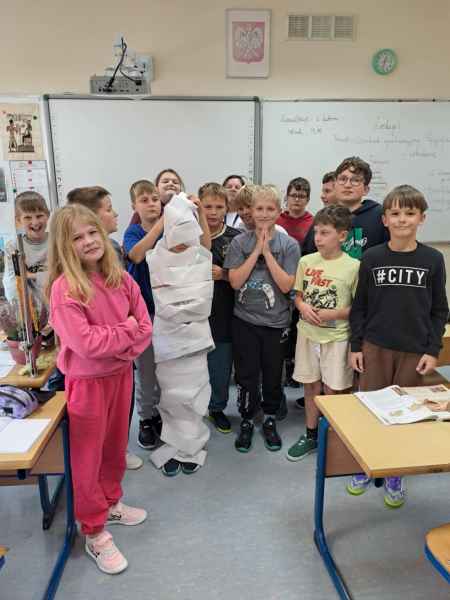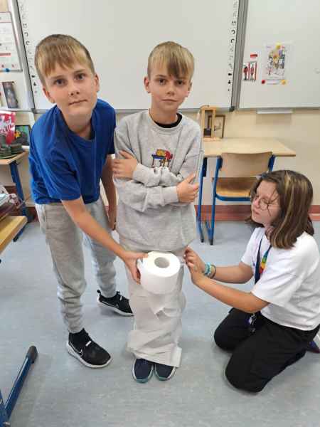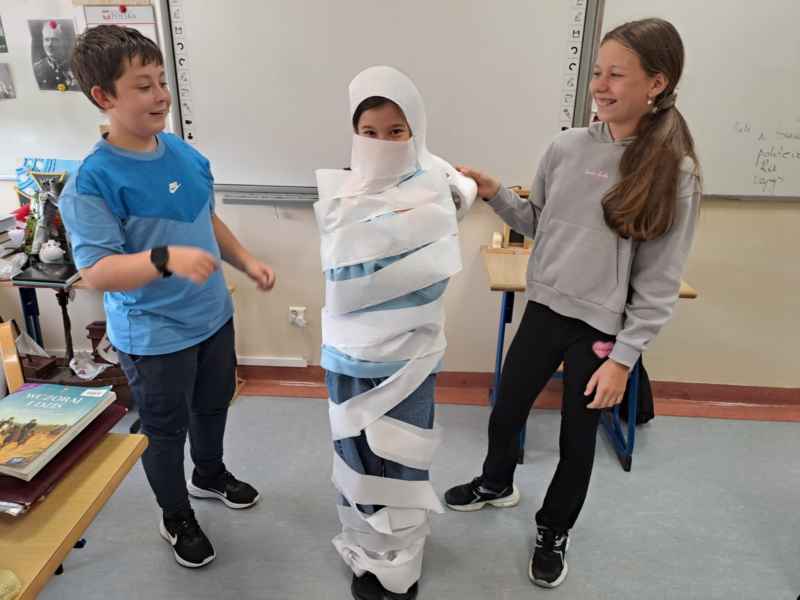 Klasa 5c i 5d odbyła "podróż" do starożytnego Egiptu. Jedną z ciekawostek była mumifikacja. Poznajecie osoby, które odegrały role faraona i kapłanów?