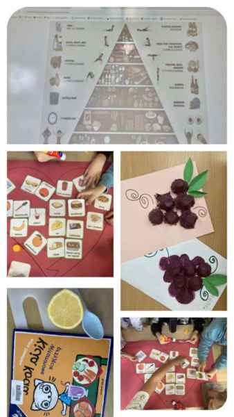 Dzieci miały również okazję wykazać się kreatywnością podczas zajęć plastycznych. W ramach działań artystycznych wykonały: owoce i warzywa z plasteliny, jabłka wyklejane bibułą, plakat dotyczący witamin oraz winogrona wykonane z opakowania po jajkach.