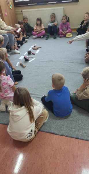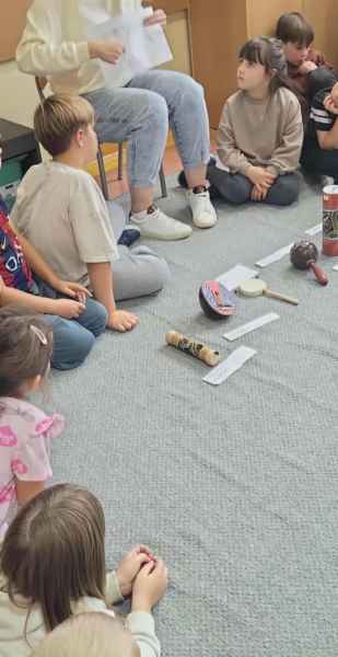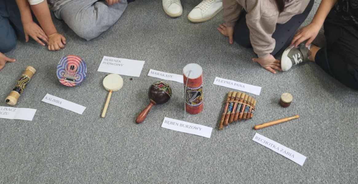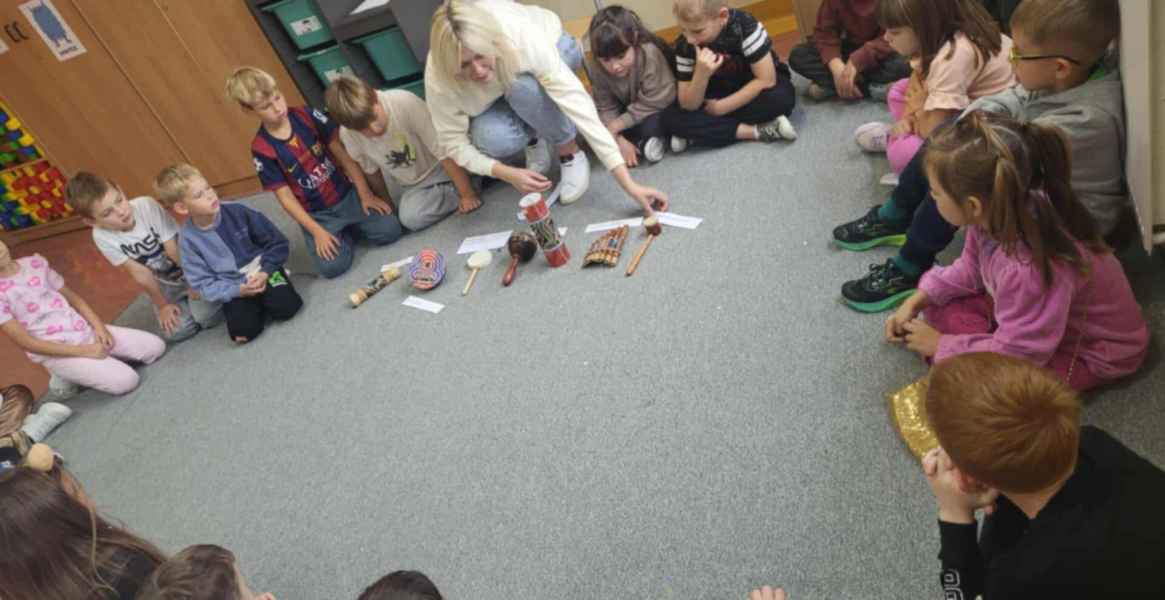W świetlicy szkolnej odbyły się wyjątkowe zajęcia warsztatowe, które poprowadziła nauczycielka geografii, pani Agnieszka. Tematem spotkania były instrumenty etniczne pochodzące z różnych zakątków świata. Uczniowie mieli okazję zapoznać się z takimi instrumentami jak: zaklinacz deszczu, kalimba, bębenek podwójny, marakasy, bęben burzowy, rechotka żabia oraz fletnia Pana. Każdy z nich został zaprezentowany zarówno pod względem pochodzenia geograficznego, jak i charakterystycznego brzmienia. Dzieci z ogromnym zainteresowaniem słuchały dźwięków wydobywanych z instrumentów oraz samodzielnie próbowały na nich grać.